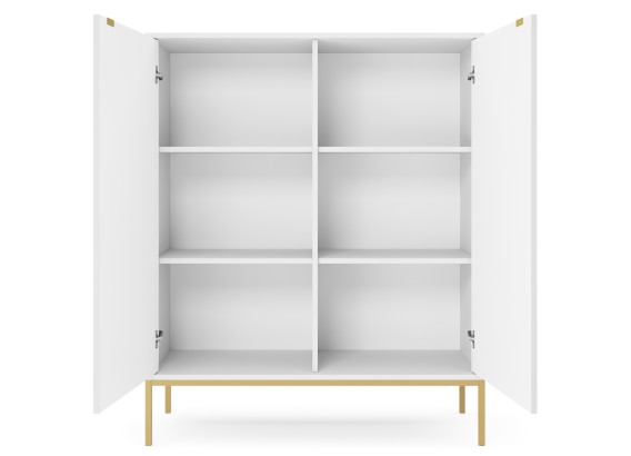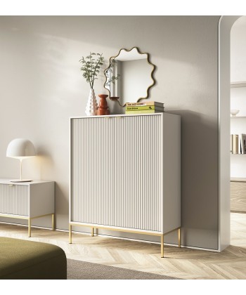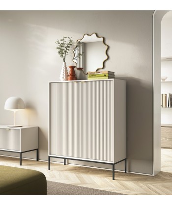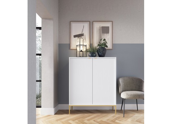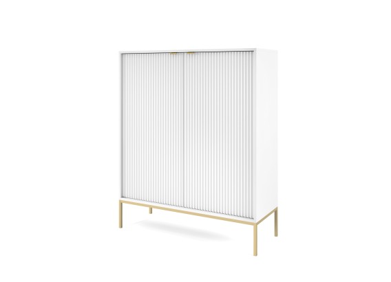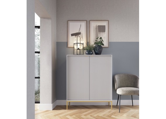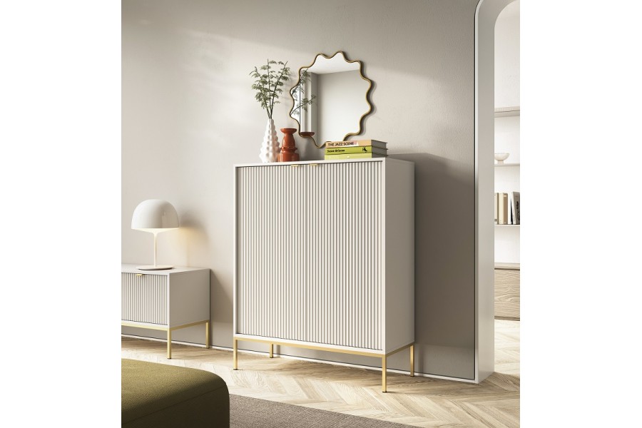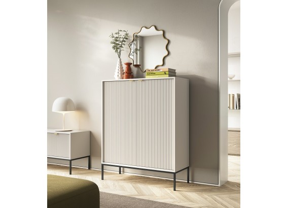 Wysoka komoda Vona to doskonały wybór dla tych, którzy potrzebują więcej miejsca do przechowywania, nie rezygnując z eleganckiego, nowoczesnego stylu. Smukła sylwetka, rytmiczne ryflowania i subtelne uchwyty tworzą harmonijną całość, która pasuje zarówno do salonu, jak i jadalni, gabinetu czy sypialni.