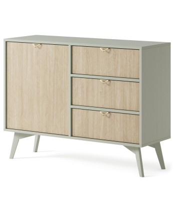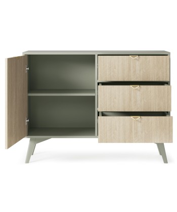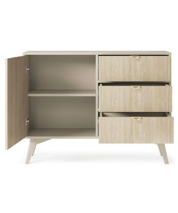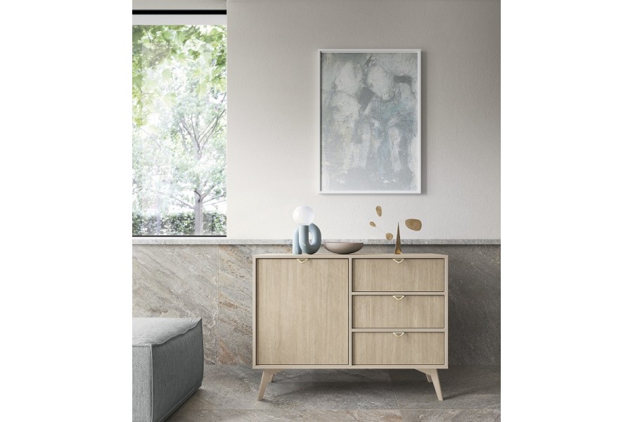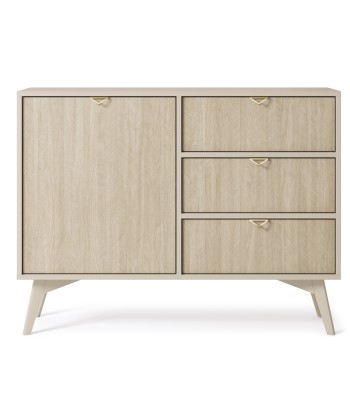 Komoda z kolekcji Resto to połączenie nowoczesnego designu z funkcjonalnością, które idealnie wpasuje się w różne style wnętrz. Mebel wyposażony jest w trzy pojemne szuflady oraz praktyczną szafkę z półką, co pozwala na wygodne przechowywanie zarówno większych przedmiotów, jak i mniejszych akcesoriów.
