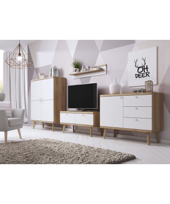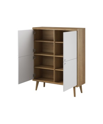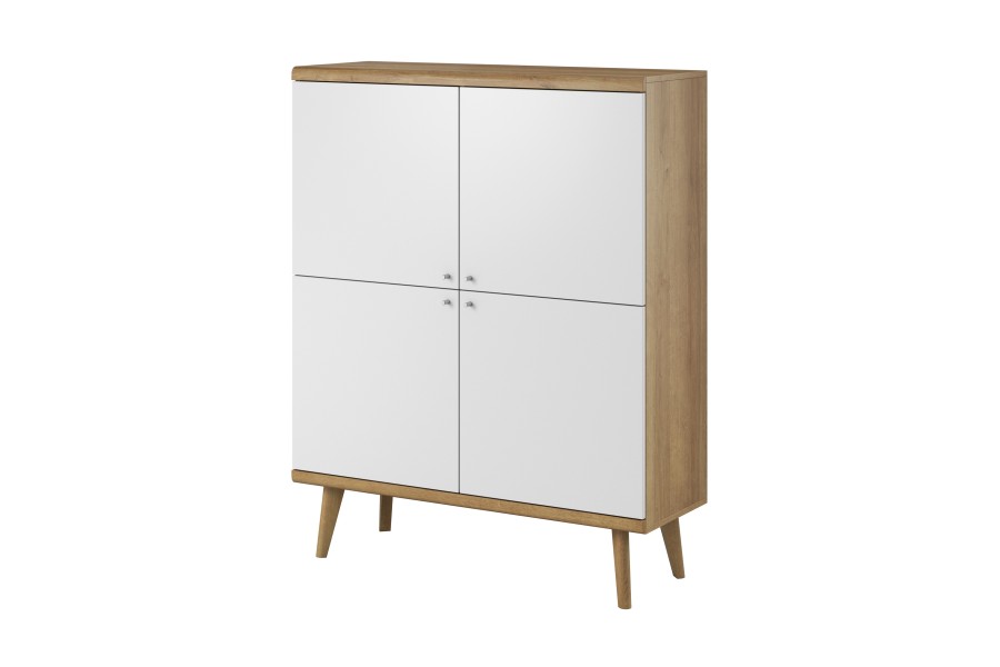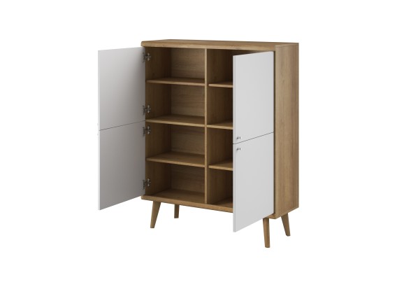 Komoda Rimo to funkcjonalny i elegancki mebel, który doskonale odnajdzie się zarówno w salonie, jadalni, jak i domowym biurze. Jej klasyczna forma nawiązuje do stylu retro, a połączenie ciepłego dekoru drewna z białymi frontami nadaje jej nowoczesnego charakteru.