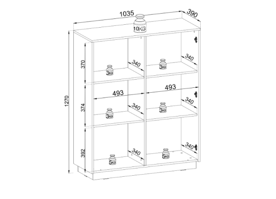 - Wysokości wewnętrzne półek: 37 cm (góra), 37,4 cm (środek), 39,2 cm (dół)