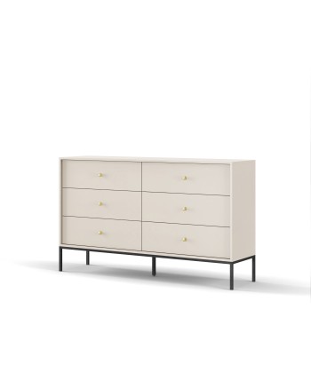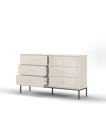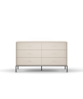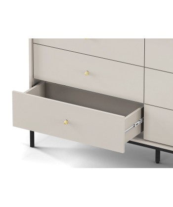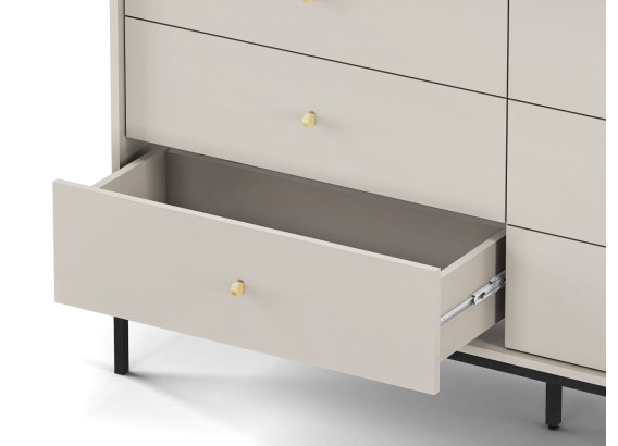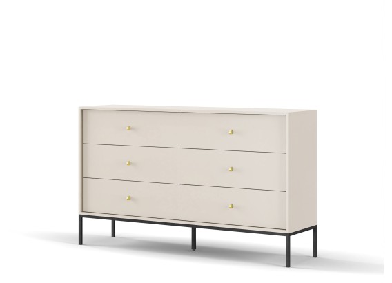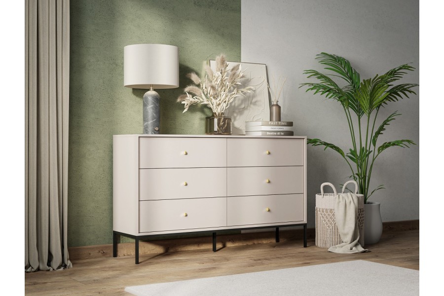 Komoda z kolekcji More to nowoczesny i pojemny mebel, który idealnie sprawdzi się w salonie, sypialni lub garderobie. Wyróżnia się elegancką formą, piaskowo bezowym wykończeniem i subtelnymi złotymi uchwytami. Osadzona jest na lekkim metalowym stelażu w kolorze czarnym (dostępna także wersja ze złotym stelażem), co nadaje jej nowoczesnego charakteru i wizualnej lekkości. Mebel wyposażony jest w sześć pojemnych szuflad, które pomieszczą ubrania, akcesoria lub inne przedmioty codziennego użytku. To funkcjonalny element wyposażenia wnętrz, który łączy estetykę z praktycznością.