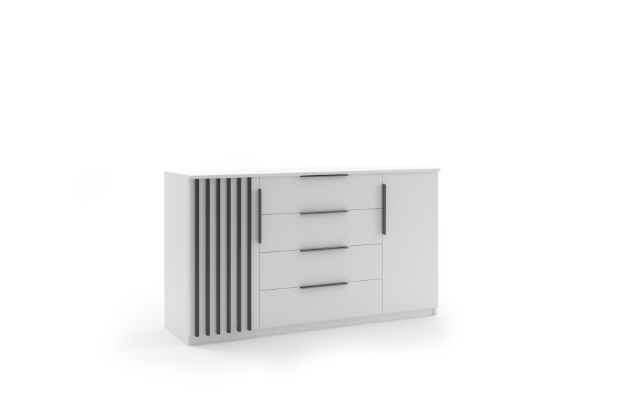 Komoda AVENA III to największy model z kolekcji AVENA, idealna do przestronnych wnętrz, w których liczy się zarówno design, jak i praktyczność. Kontrast czarnych lameli na tle białych frontów tworzy nowoczesny, wyrazisty efekt, który świetnie wpasuje się w modne aranżacje.