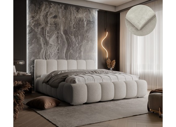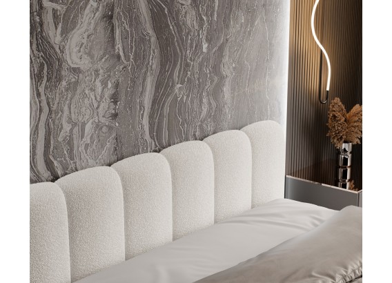To łóżko to esencja komfortu i nowoczesnego designu. Charakterystyczne, zaokrąglone segmenty tworzące zarówno podstawę, jak i wezgłowie nadają mu wyjątkowej formy – miękkiej, otulającej i przyciągającej wzrok. Dzięki tej unikatowej konstrukcji łóżko pełni nie tylko funkcję użytkową, ale również dekoracyjną.