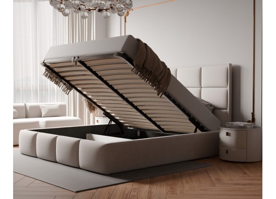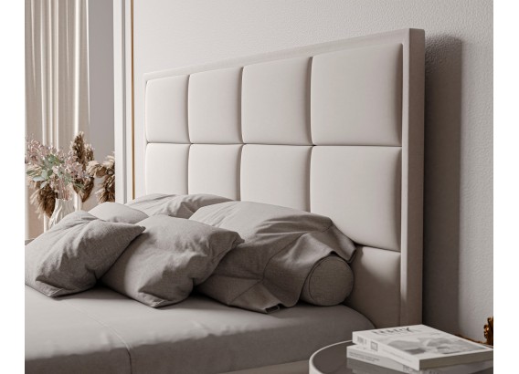 To łóżko to doskonałe połączenie nowoczesnego designu i przytulnej elegancji. Wysokie, tapicerowane wezgłowie z modułowym układem prostokątnych paneli tworzy eleganczne, geometryczne tło dla strefy wypoczynku. Subtelnie zaokrąglona podstawa z miękkimi segmentami dopełnia całości, zapewniając komfort i wyjątkowy wygląd.