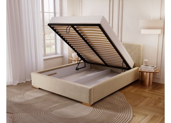 Przestronny pojemnik na pościel, otwierany za pomocą podnośników gazowych, pozwala w pełni wykorzystać przestrzeń sypialni. Łóżko dostępne jest w czterech standardowych rozmiarach: 140×200, 160×200, 180×200, 200×200 cm.