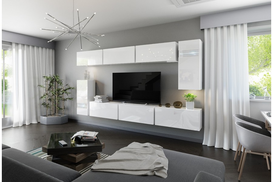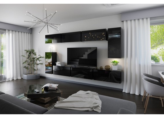 Box 2 to nowoczesna meblościanka w wysokim połysku z systemem push-to-open i opcjonalnym oświetleniem LED. Idealna do eleganckich, minimalistycznych wnętrz.