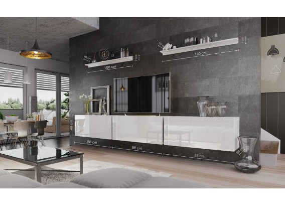 - Półki wiszące (2x): 7 cm (wysokość) x 100 cm (szerokość) x 10 cm (głębokość)