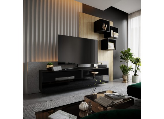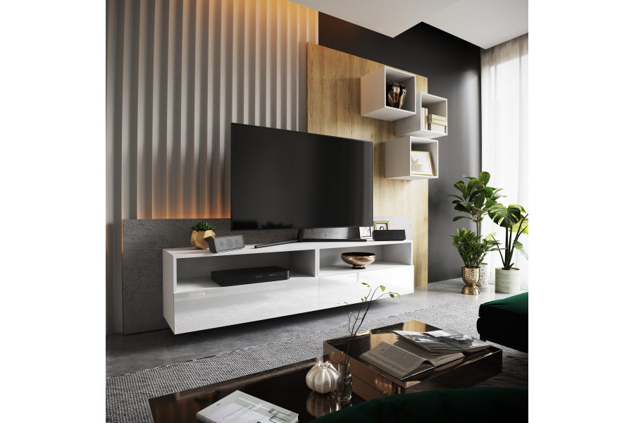 Meblościanka 2&5 BOX idealnie wpasuję się do twojego salonu dzięki jego nowoczesnemu designowi. Szafki można wieszać w dowolny sposób. Szafki nie posiadają uchwytów mają zamontowany sposób otwierania: push to open