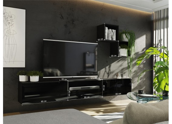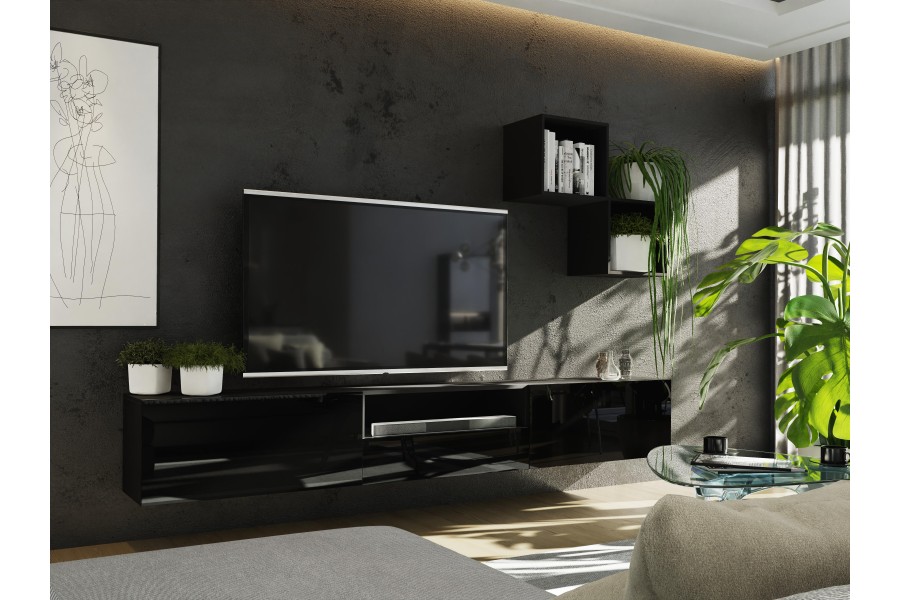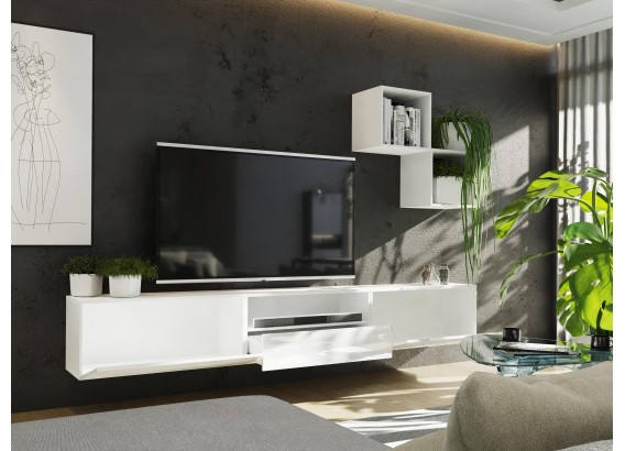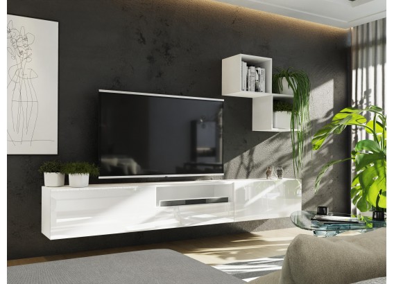 Meblościanka 3&5 BOX idealnie wpasuję się do twojego salonu dzięki jego nowoczesnemu designowi. Szafki można wieszać w dowolny sposób. Szafki nie posiadają uchwytów mają zamontowany sposób otwierania: push to open