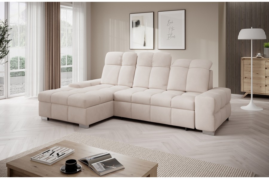 Nowoczesny narożnik wypoczynkowy PRESTIGE S stworzony z myślą o maksymalnym komforcie i funkcjonalności. Idealnie sprawdzi się w salonie lub pokoju dziennym, oferując wygodne miejsce do wypoczynku w ciągu dnia oraz pełnowymiarową powierzchnię do spania na noc.