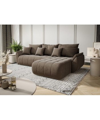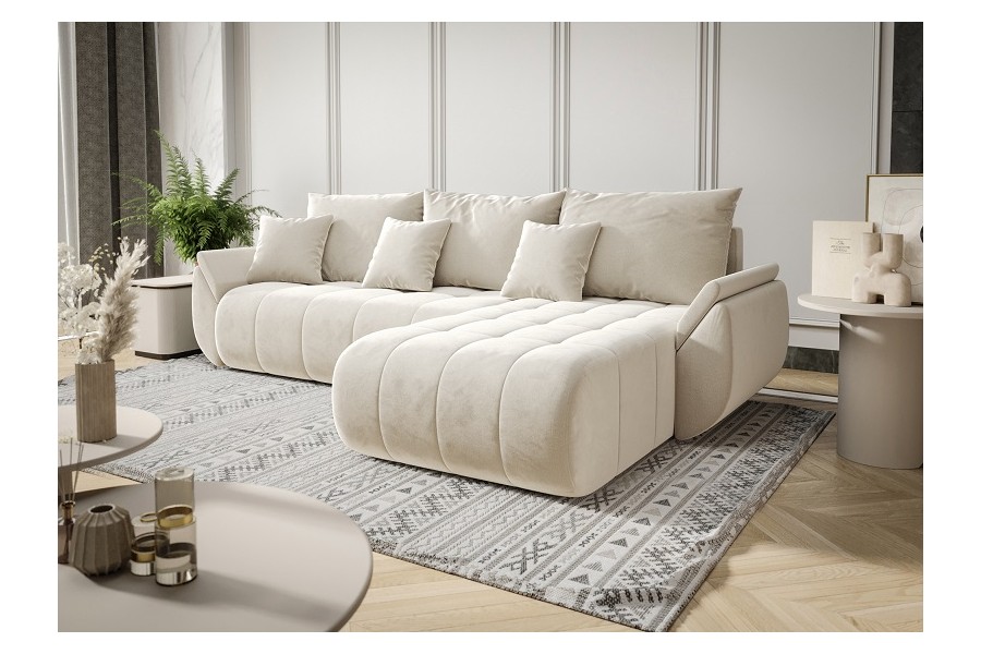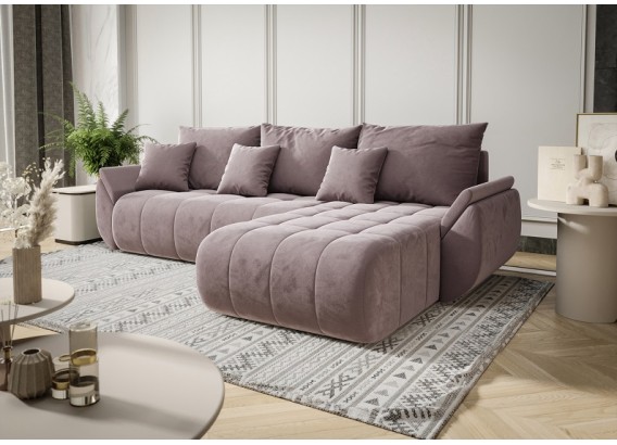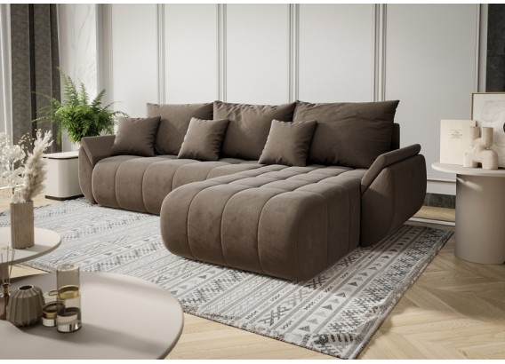 Narożnik Pesto to połączenie stylowego wyglądu z funkcjonalnością na najwyższym poziomie. Charakterystyczne, zaokrąglone kształty i miękkie pikowania nadają mu wyjątkowego charakteru, a welurowa tkanina sprawia, że prezentuje się niezwykle elegancko i nowocześnie. Idealny do salonów, które mają być zarówno przytulne, jak i stylowe.