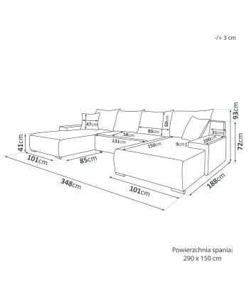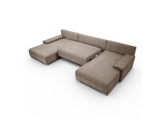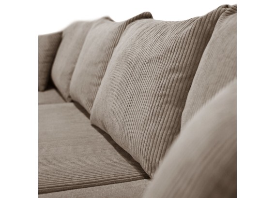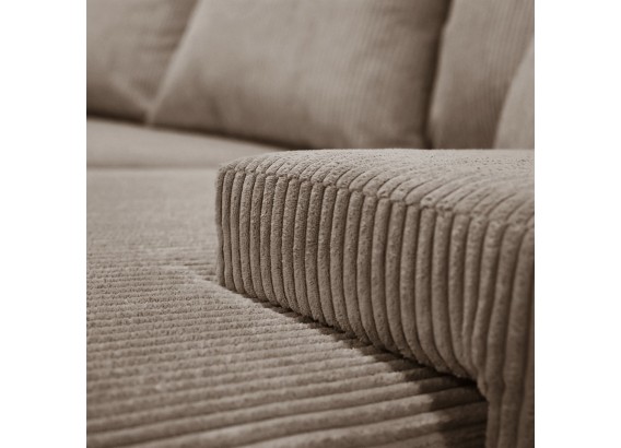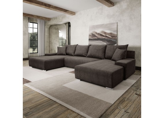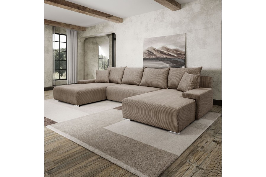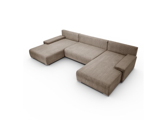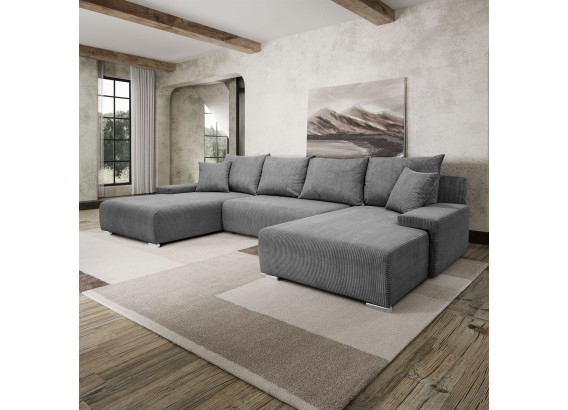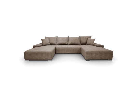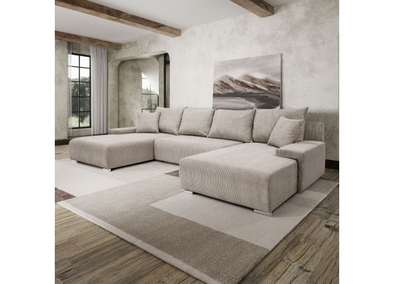 Ten przestronny narożnik w kształcie litery U to połączenie minimalistycznego designu, nowoczesnej wygody i uniwersalnej formy, która świetnie wkomponuje się w każde wnętrze. Miękka w dotyku tkanina o subtelnej strukturze dodaje przytulności, a szerokie siedziska i głębokie oparcia zapraszają do wypoczynku – niezależnie od tego, czy urządzasz wieczór filmowy, drzemkę czy spotkanie z bliskimi.