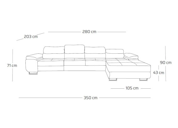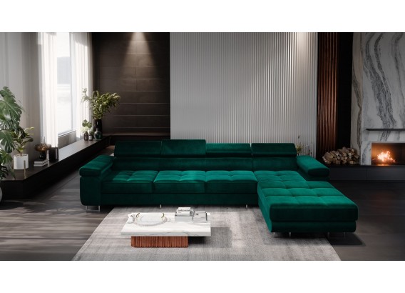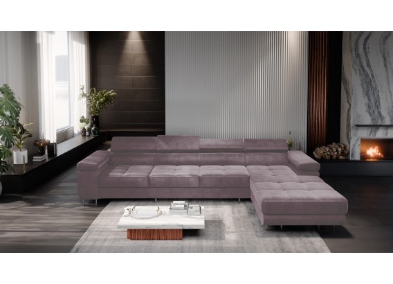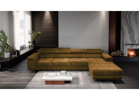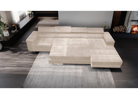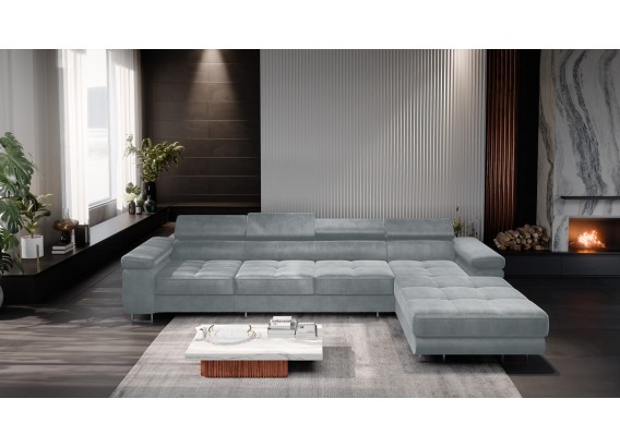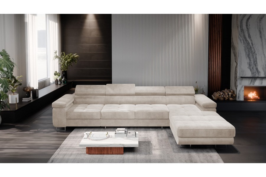 Nowoczesny narożnik Velvet Maxi to połączenie przestronności, wygody i stylowego wzornictwa. Zaprojektowany z myślą o przyszłości i codziennym komforcie, oferuje dużą ilość miejsca do siedzenia, funkcję spania oraz praktyczny pojemnik na pościel.
