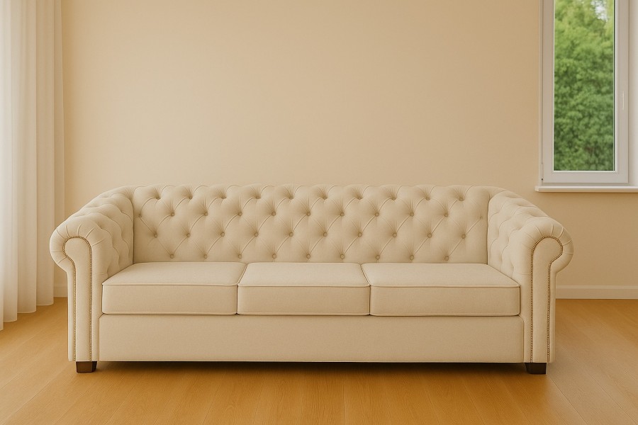 Połączenie nowoczesnej formy z klasyczną elegancją. Sofa Chesterfield Lux w ekskluzywnej tkaninie Monolith 04 zachwyca subtelnymi zdobieniami i eleganckimi pikowaniami, które nadają jej ponadczasowego charakteru.