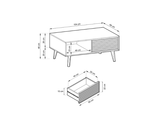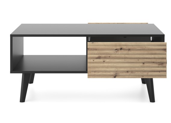 - Funkcjonalna przestrzeń – otwarta półka oraz praktyczny schowek z przesuwnym frontem pozwalają na estetyczne przechowywanie pilotów, gazet czy drobiazgów.