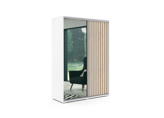 KIARA to nowoczesna szafa przesuwna o szerokości 150 cm, stworzona z myślą o stylowych, jasnych wnętrzach. Zachwyca subtelną formą, funkcjonalnością i ozdobnymi lamelami w dekorze Craft złoty, które w połączeniu z klasyczną bielą tworzą wyjątkowo elegancki efekt.