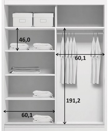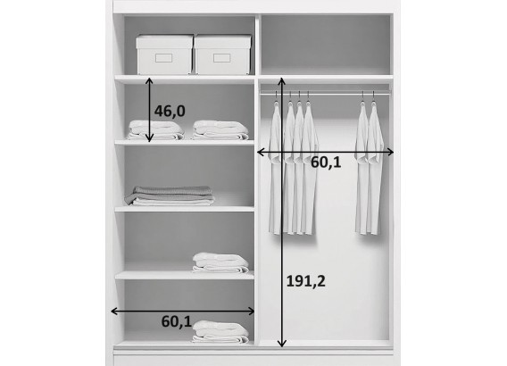 Wnętrze szafy zostało zaprojektowane tak, aby maksymalnie wykorzystać przestrzeń. Znajdziesz w nim praktyczne półki na odzież i dodatki oraz drążki na ubrania wiszące, co pozwala uporządkować garderobę według własnych potrzeb. Dzięki systemowi przesuwnemu Laguna drzwi otwierają się lekko i cicho, co sprawia, że korzystanie z szafy jest niezwykle komfortowe.