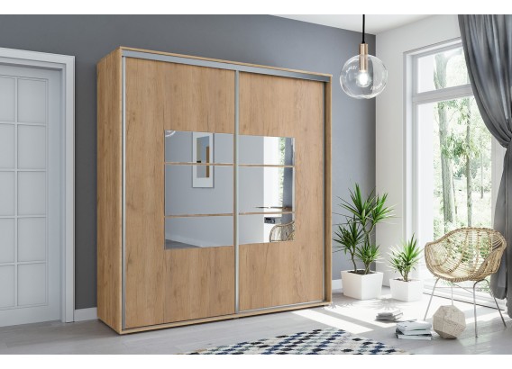 Szafa A2 to połączenie nowoczesnego stylu i funkcjonalności, stworzone z myślą o osobach ceniących elegancję i praktyczne rozwiązania. Charakterystyczne fronty z lustrami i dekoracyjnym podziałem nadają jej wyjątkowego wyglądu, a jednocześnie sprawiają, że wnętrze wydaje się jaśniejsze i przestronniejsze.