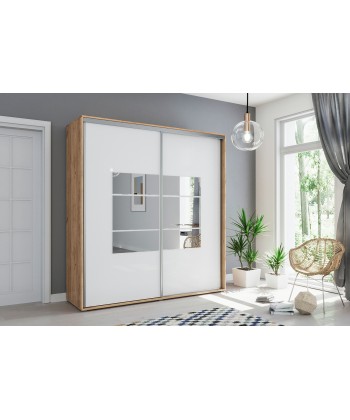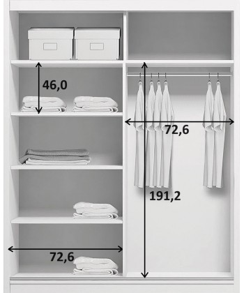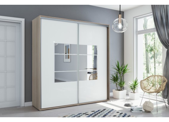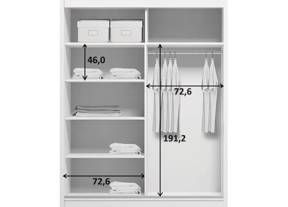 Dzięki przesuwnym drzwiom z systemem Laguna korzystanie z szafy jest wygodne i ciche. Pojemne wnętrze wyposażone w półki i drążki umożliwia przechowywanie zarówno ubrań wiszących, jak i składanych. To mebel, który świetnie sprawdzi się w sypialni, garderobie czy przedpokoju.