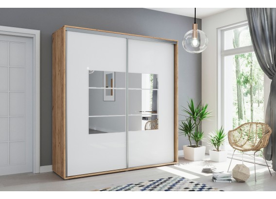 Szafa A2 to połączenie nowoczesnego stylu i funkcjonalności, stworzone z myślą o osobach ceniących elegancję i praktyczne rozwiązania. Charakterystyczne fronty z lustrami i dekoracyjnym podziałem nadają jej wyjątkowego wyglądu, a jednocześnie sprawiają, że wnętrze wydaje się jaśniejsze i przestronniejsze.