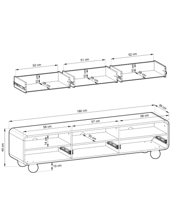 - Trzy otwarte wnęki z otworami – wygodne miejsce na dekodery, konsole czy odtwarzacze.