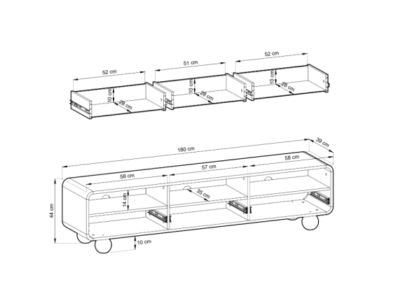 - Trzy pojemne szuflady – idealne do przechowywania kabli, pilotów i innych akcesoriów.