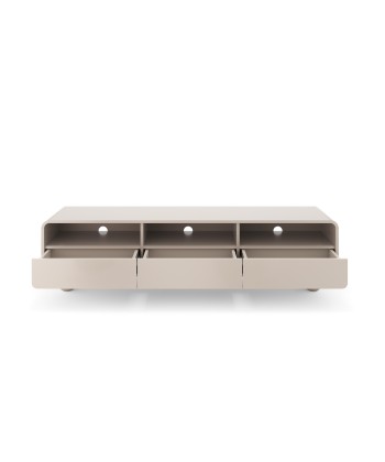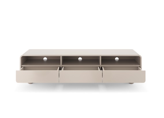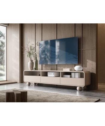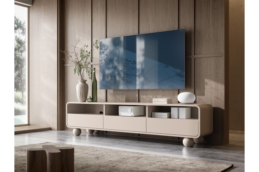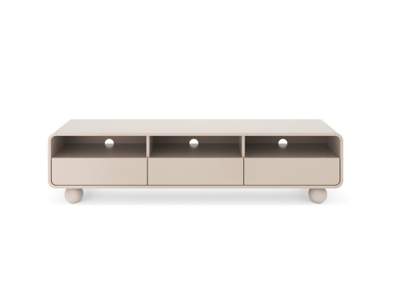 Szafka RTV 180 z kolekcji Alvar w kolorze kaszmir to mebel stworzony z myślą o eleganckich, nowoczesnych wnętrzach. Wyposażona w trzy praktyczne szuflady oraz trzy otwarte wnęki z otworami na przewody, idealnie sprawdzi się do przechowywania sprzętu multimedialnego i akcesoriów. Zaokrąglone krawędzie oraz charakterystyczne kuliste nóżki nadają jej wyjątkowego uroku i sprawiają, że prezentuje się lekko i designersko.